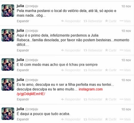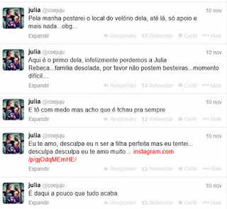 A polícia de Parnaíba abriu um inquérito para investigar as circunstâncias da morte da adolescente Julia Rebeca. Ela foi encontrada morta em seu quarto no último domingo (10). Antes de morrer ela deixou mensagens de despedida e desculpas em redes sociais.Em sua conta do Twitter, do dia 10 de novembro, a jovem postou frases de pedido de desculpa aos pais e se despedindo.Em seguida, o primo dela atualiza a página, confirmando a morte da jovem e que iria divulgar o local do velório. A hipótese é de que ela tenha cometido suicídio após um vídeo de sexo entre ela, uma outra jovem e um homem ter sido divulgado através do programa de compartilhamento de mensagens e arquivos WhatsApp.